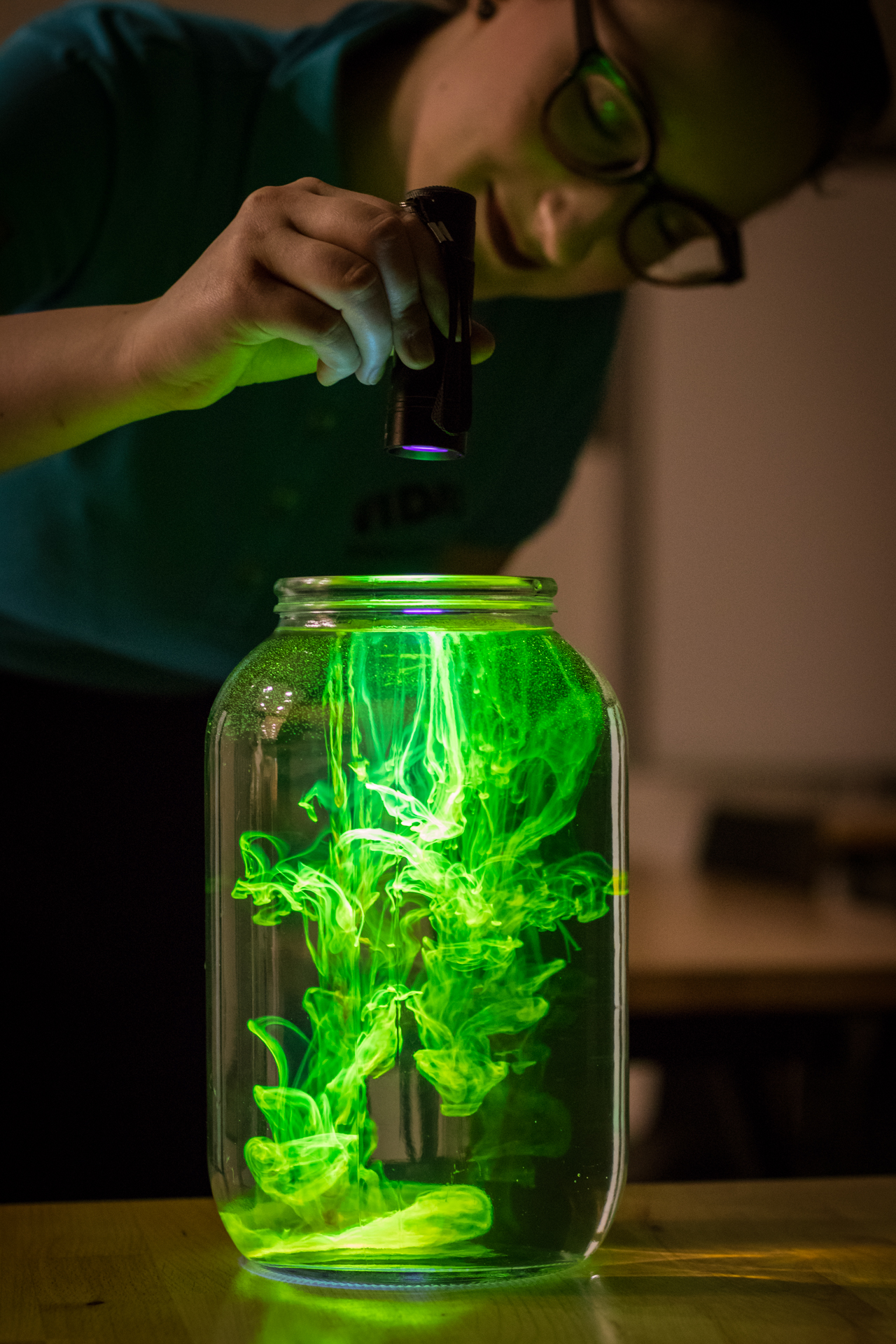 Fluorescein ve vodě pod UV světlem | VIDA! science centrum | Vlastní tvorba | CC BY-SA | 2021-10-28 |