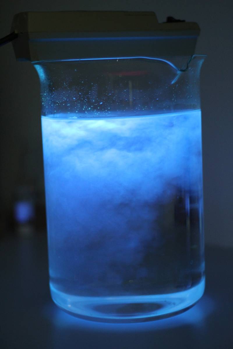 Prací prášek ve vodě pod UV světlem | VIDA! science centrum | Vlastní tvorba | CC BY-SA | 2021-10-28 |