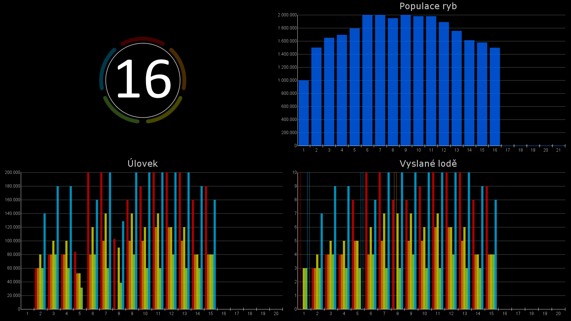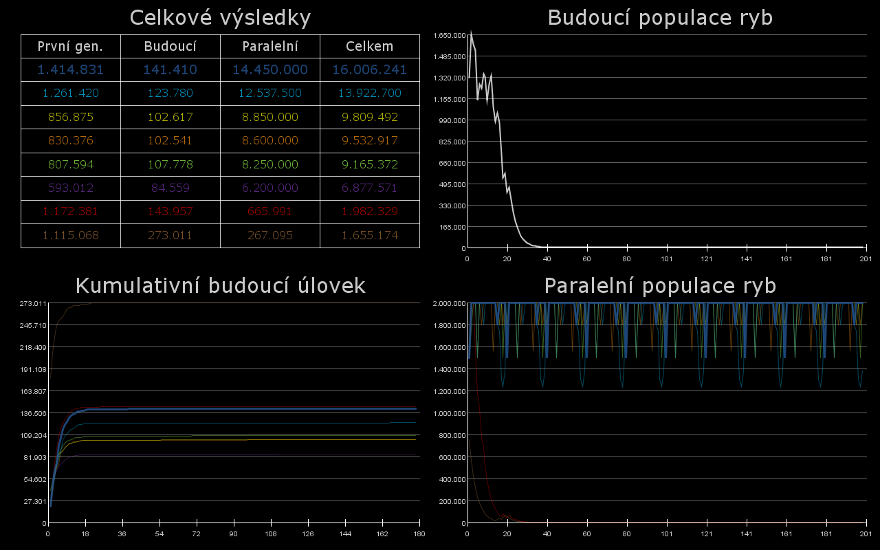 Po dosažení konce první generace zobrazíme celkové údaje, zisky budoucích generací v tomto a paralelních světech a stavy populace ryb v mořích. Lze také najet myší na některý z řádků souhrnné tabulky vlevo nahoře a poté se zvýrazní údaje týkající se daného týmu.