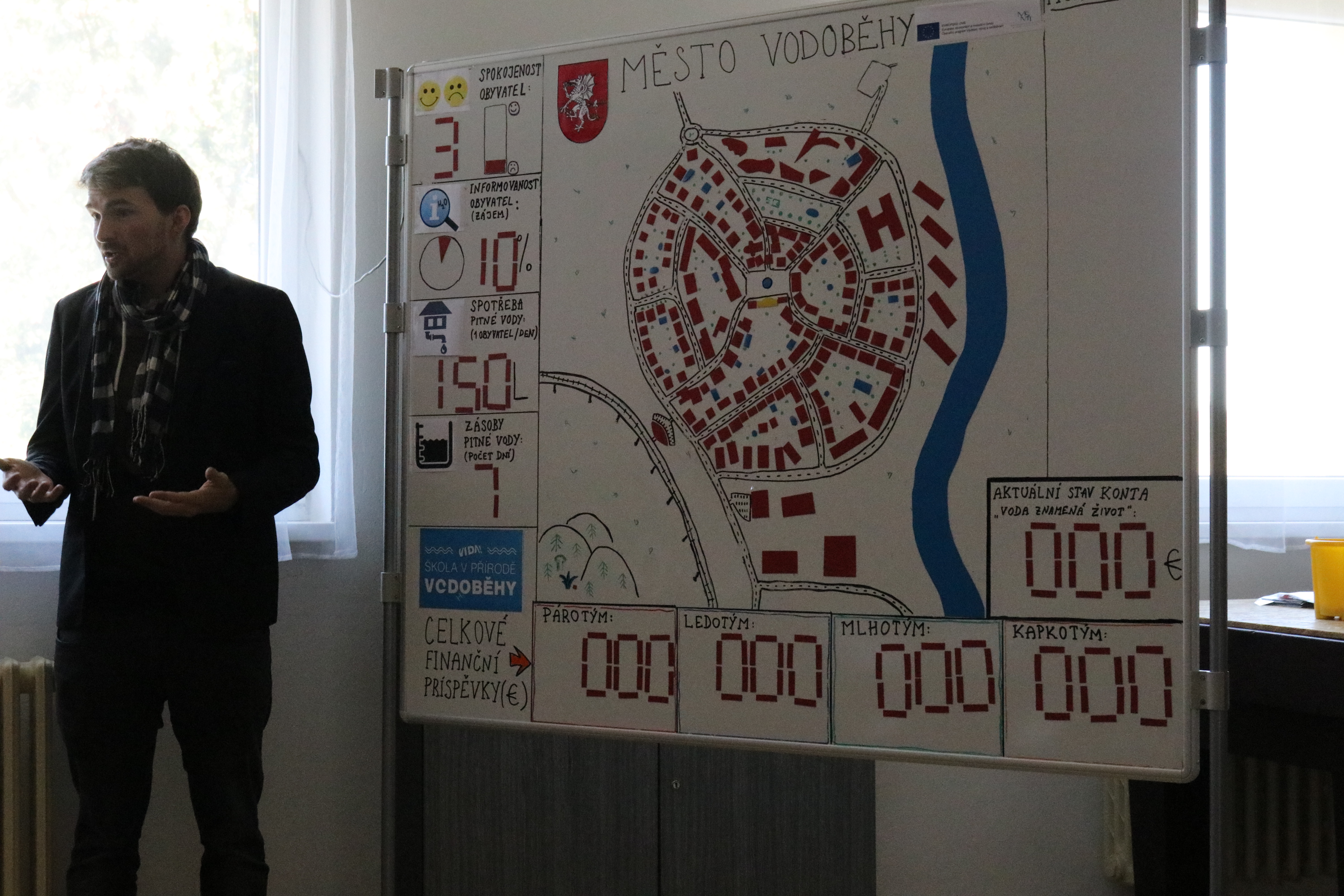 - “Byl bych tedy velmi rád, kdyby se město dlouhodobě na problematiku hospodaření s vodou zaměřilo a proto představuji nový projekt, který jsem pojmenoval “Voda znamená život”. Aby se věci v městě začaly měnit k dobrému, je samozřejmě zapotřebí do nich investovat peníze. Proto jsem založil konto, ze kterého budou změny financovány. Momentálně ale na kontě nejsou žádné finance (současné platidlo jsou takzvané V-coiny, neboli virtuální mince). Zvu tedy vás jako angažované občany, abyste se pokusili získat finance pro projekt od různých sponzorů. Sponzoři budou jistě vstřícnější, když projevíte znalost celé problematiky. Proto jsem pozval několik jeho kolegů odborníků a sám se v problematice také vzdělávám. Tito odborníci jsou zde, aby vás v problematice co možná nejlépe zorientovali, a vy jste pak sami mohli získat finance od sponzorů. Zároveň od vás očekávám, že mi budete radit, které z navržených změn se mají v městě realizovat. Z toho důvodu jsem sestavil 5-6 členné týmy, ve kterých budete jako občané pracovat. Máte k celému projektu nějaké dotazy?”