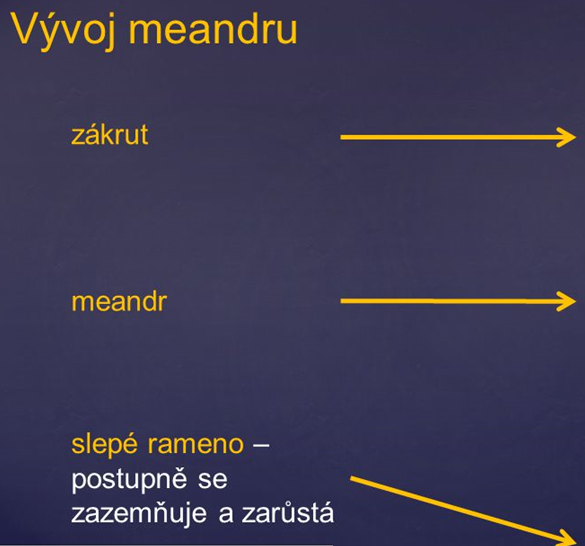 • Podívejte se na obrázek vývoje meandru, jak může vzniknout slepé rameno.